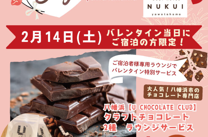 2月14日(土)ご宿泊のお客様限定で、バレンタイン特別サービスをご用意いたしました。 当日は、1Fのご宿泊者様専用ラウンジにて八幡...