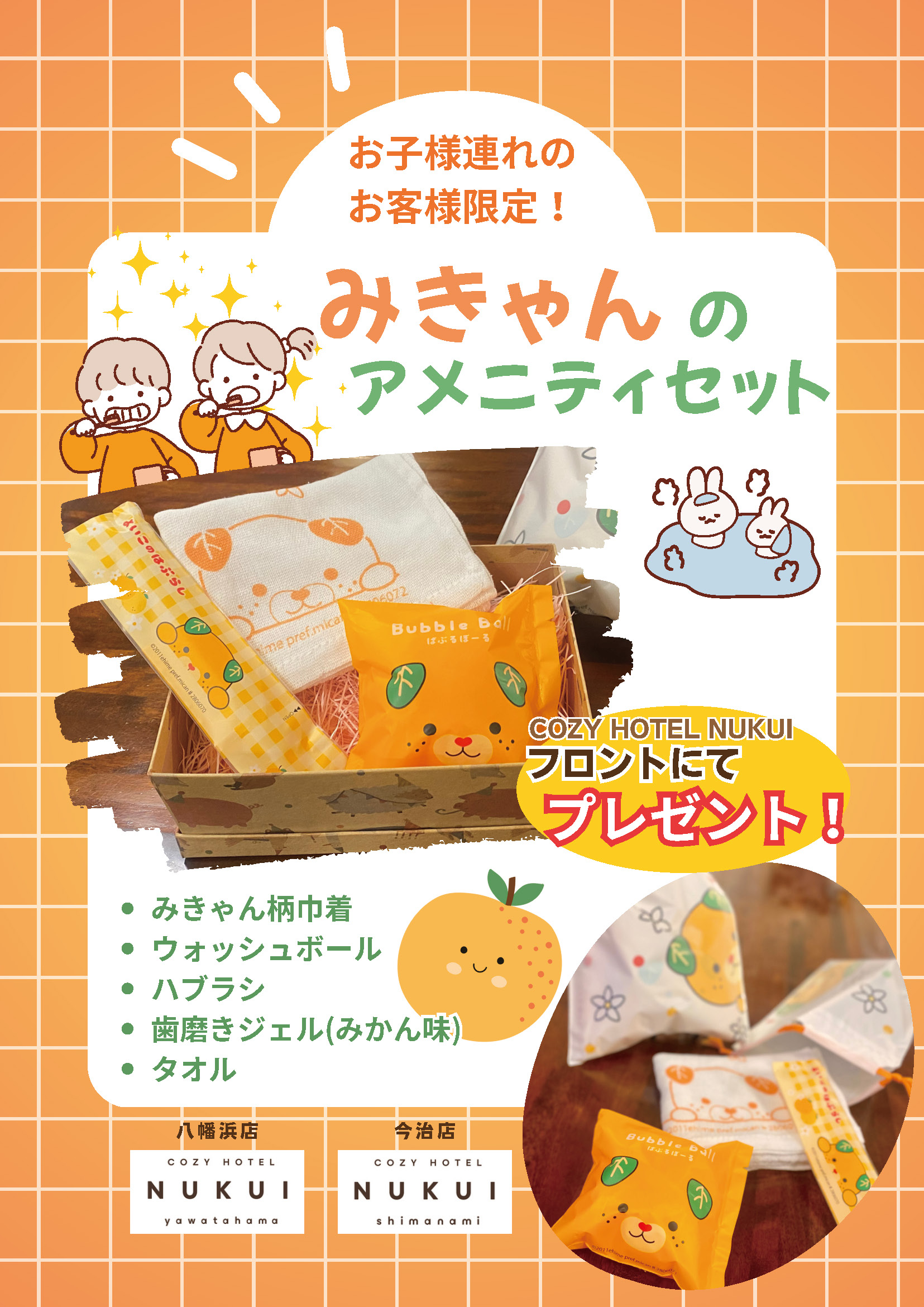 お子様連れのお客様限定で「みきゃんのアメニティセット」をプレゼント中です。