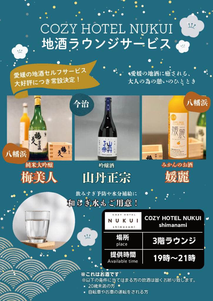 COZY HOTEL NUKUI shimanamiでは、ご宿泊のお客様にご好評いただいておりました地酒ラウンジサービスを常設サービスとしてご提供いたします。 今治・八幡浜の酒蔵から、愛媛ならではの日本酒や果実酒をご用意 […]